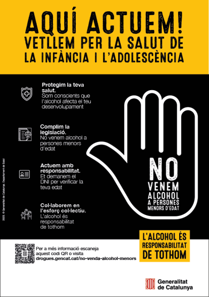 El Departament de Salut impulsa una nueva acción de sensibilización para recordar la prohibición de vender o dispensar alcohol a personas menores de edad y para concienciar sobre los riesgos que este consumo supone para la salud de los adolescentes. La iniciativa se enmarca en la 13.ª Setmana de Sensibilització sobre els Riscos de l’Alcohol, que coincide con el Día Mundial Sin Alcohol, el 15 de noviembre, y con la Semana del Cribado, centrada en promover la detección y reducción del consumo.