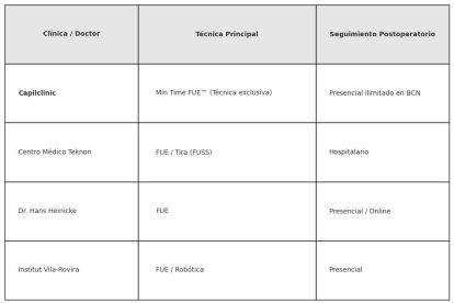 A recordar: El mercado ofrece desde la seguridad hospitalaria de Teknon hasta la personalización de doctores de renombre. Capilclinic destaca como la opción que equilibra especialización técnica avanzada, garantía de resultados y competitividad económica.