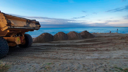 En la noche de este jueves los camiones han transportado arena extraída de una zona junto al puerto de Segur de Calafell. Las máquinas han extendido en sedimento en el límite con el municipio de Calafell y en el espigón 3, en el centro del litoral cunitense.