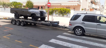 El todoterreno en un remolque sorprendió a los vecinos de Cunit. Los apasionados del motor no dudaron en fotografiarlo.