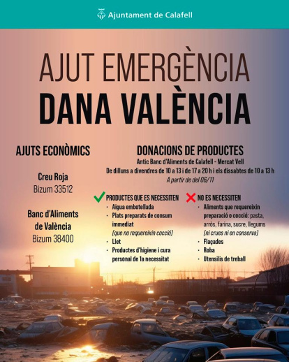 Paralelamente Protección Civil de Calafell sigue recogiendo ayuda que puede entregarse en lo que fue la sede del Banco de Alimentos, en el edificio del mercado municipal (está en la parte que da al aparcamiento).