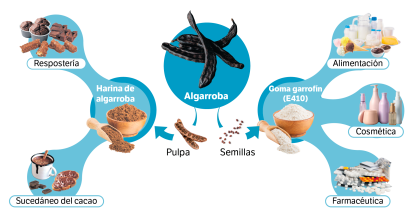 Tradicionalmente ligado a la alimentación del ganado, la algarroba es un producto cada vez más apreciado en la industria alimentaria, además de ser un espesante y gelificante natural para todo tipo de productos.
