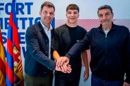 Rafa Barber, junto a Jofre Torrents y Xavi Castro, cuando el de La Selva del Camp renovó de azulgrana hasta 2028.