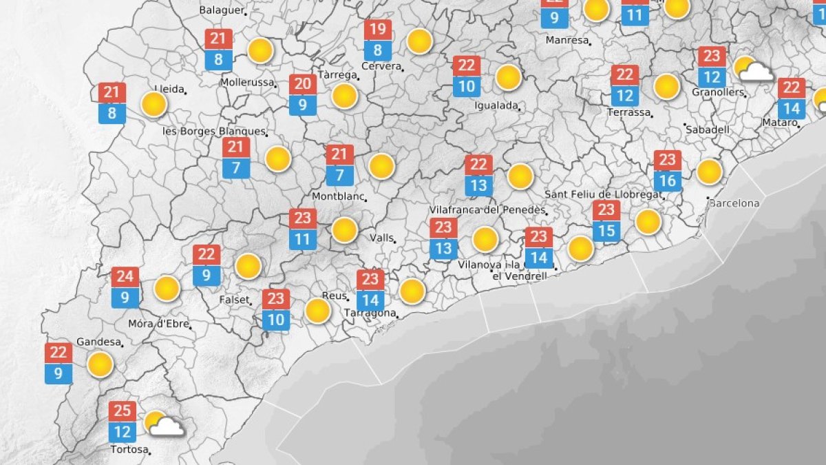 La temperatura mínima baixarà moderadament, excepte a cotes altes i mitjanes del Pirineu, on serà lleugerament més alta. La màxima patirà un lleuger ascens, tot i que a Ponent i les Terres de l'Ebre pot ser similar o lleugerament més baixa.