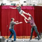 Trapezi. La feria estuvo repleta de actos, con artistas caminando sobre tablones de madera en la Casa Rull o sobrevolando la plaza del Mercadal