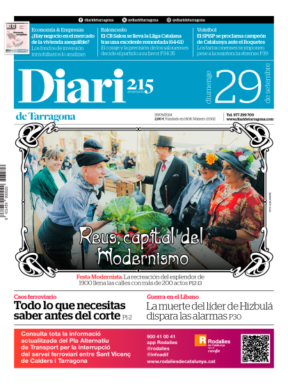 Diari Impreso Diari Impreso Portada del Diari del domingo 29 Facebook Twitter Bluesky Send Whatsapp Whatsapp Telegram Copiar enlace Publicado por Diari de Tarragona Creado: 28.09.2024 | 23:50 Actualizado: 29.09.2024 | 23:50 Ver Documento SUSCRÍBETE Lo más leído Fallece el empresario Avelino Masià en un trágico accidente con su tractor en Amposta Nuevo cambio en Mercadona: el supermercado quiere despedirse de dos de sus grandes secciones Alerta amarilla por viento en seis puntos de Tarragona: rachas de hasta 90 km/h Luces, disfraces y mucho confeti en la celebración del Cós Blanc de Salou Adelantamiento ilegal entre dos camiones en la AP-7 en L'Ametlla de Mar Lo último Portada del Diari del lunes 9 de febrero de 2026 Carnaval en Tarragona: las mejores imágenes de la Disfressa d'Or 2026 Cristóbal Parralo tras la derrota del Nàstic ante el Villarreal B: "La expulsión ha condicionado el partido" El PP gana las elecciones de Aragón pero necesita aún más a Vox, que duplica su fuerza La comparsa Som i Serem gana la Disfressa d'Or de Tarragona