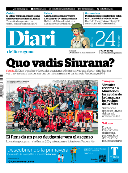 Diari Impreso Diari Impreso Portada del Diari del lunes 24 Facebook Twitter Bluesky Send Whatsapp Whatsapp Telegram Copiar enlace Publicado por Diari de Tarragona Creado: 23.03.2025 | 23:37 Actualizado: 24.03.2025 | 23:37 En: portada del Diari Ver Documento SUSCRÍBETE Lo más leído Nuevo cambio en Mercadona: el supermercado quiere despedirse de dos de sus grandes secciones Fallece el empresario Avelino Masià en un trágico accidente con su tractor en Amposta Pequeña explosión en un edificio de Vila-seca Sí, la borrasca Marta también afectará a Tarragona: sigue la lluvia en toda la provincia ¿Has visto a estos hombres? Los Mossos los buscan por una agresión grave a un vigilante de Renfe Lo último Abren los colegios para que voten 1.036.325 personas en las elecciones aragonesas Les pluges i l’entrada de cítrics de Sud-àfrica fan caure els preus de la clementina a l’Ebre Zartu: la empresa que puede sacar polímeros de viejas pelotas de pádel EEUU reacciona a la ofensiva comercial europea: entrar en la India son palabras mayores Un obús al recte?