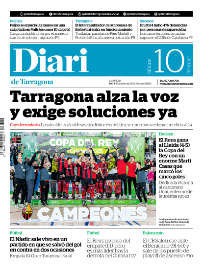 Diari Impreso Diari Impreso Portada del Diari del lunes 10 Facebook Twitter Bluesky Send Whatsapp Whatsapp Telegram Copiar enlace Publicado por Diari de Tarragona Creado: 09.03.2025 | 23:22 Actualizado: 10.03.2025 | 23:22 Ver Documento SUSCRÍBETE Lo más leído Nuevo cambio en Mercadona: el supermercado quiere despedirse de dos de sus grandes secciones Fallece el empresario Avelino Masià en un trágico accidente con su tractor en Amposta Pequeña explosión en un edificio de Vila-seca ¿Has visto a estos hombres? Los Mossos los buscan por una agresión grave a un vigilante de Renfe Sí, la borrasca Marta también afectará a Tarragona: sigue la lluvia en toda la provincia Lo último Zartu: la empresa que puede sacar polímeros de viejas pelotas de pádel EEUU reacciona a la ofensiva comercial europea: entrar en la India son palabras mayores Un obús al recte? Cargo Una altra coalició de voluntaris