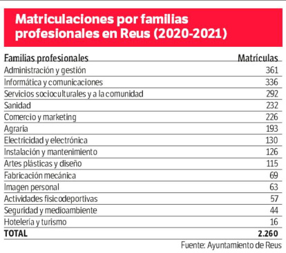Administración y gestión; informática y comunicaciones; servicios socioculturales y a la comunidad; y sanidad. Estos son los estudios de Formación Profesional (FP) que mayor interés generan en Reus. Solo estas cuatro ramas suman más del 50% de las matriculas, según el documento Reus, diagnosi en clau de FP.