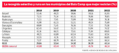 La mitad de municipios del Baix Camp ya reciclan más de un 55% de los residuos generados. Es decir, alcanzan los objetivos marcados por la Unión Europea, que exige que la recogida selectiva sea de un 55% para 2025. Según los últimos datos de la Agència de Residus de Catalunya –que corresponden a 2022–, del total de 28 poblaciones del Baix Camp, 15 son los que cumplen con este hito y, de éstos, 12 incluso alcanzan el objetivo europeo para 2030 de recoger selectivamente el 60% de los residuos.