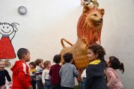 Joves que es posen a la pell del Lleó Petit de Reus durant Misericòrdia