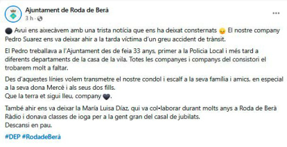 El fallecido entró de interino en la Policía Local de Roda de Berà y tras 15 años pasó a otros departamentos del Ayuntamiento, cumpliendo hasta el accidente de ayer 33 años de servicio público. Precisamente, en las redes sociales del consistorio, esta mañana se daba eco de la notica triste.