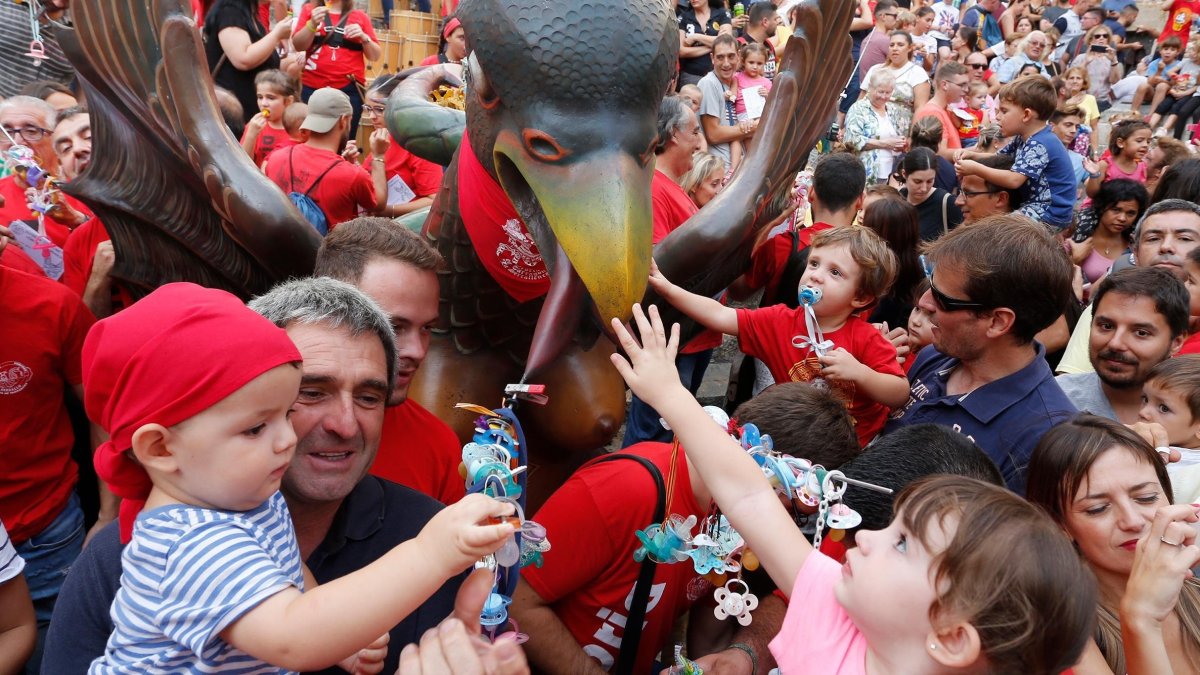 Cerca de 300 niños depositaron el chupete en las varillas que salen de la lengua bífida de este elemento del Seguici. Juan, de tres años, dejó hasta diez. Su madre los llevaba dentro de la mochila y, uno a uno, el pequeño los iba colgando. «La única manera de cerrar el ciclo es entregándolos todos. Sino, se los encontrará por casa y no habremos conseguido nada», decía Lucia, la madre de Juan.