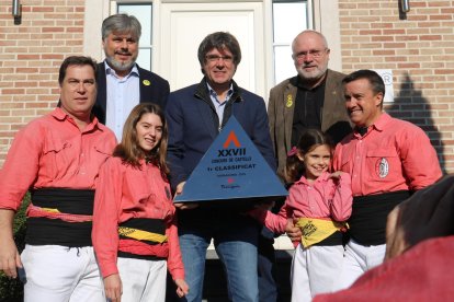 La Colla Vella dels Xiquets de Valls ha lliurat aquest dissabte el trofeu del XXVII Concurs de Castells de Tarragona a l'expresident Carles Puigdemont en una recepció davant de la Casa de la República, a Waterloo.